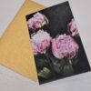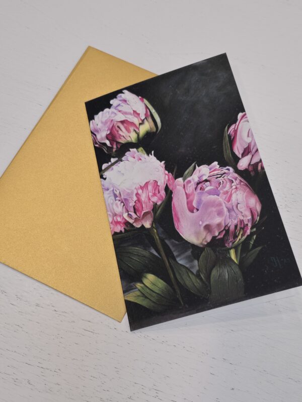 Na een Poll op Instagram of de volgende kaart Pioenrozen moesten worden of Dahlia’s, won de Pioenroos. Met de mooie donkere achtergrond komen de kleuren van deze pioenrozen nog mooier uit!